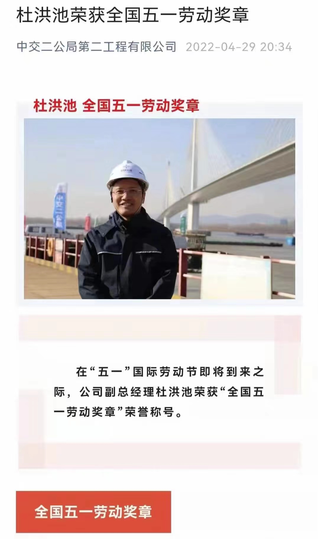2022年4月,杜洪池在任中交二公局二公司副总经理兼龙潭A4标项目经理期间,荣获“全国五一劳动奖章”荣誉称号。