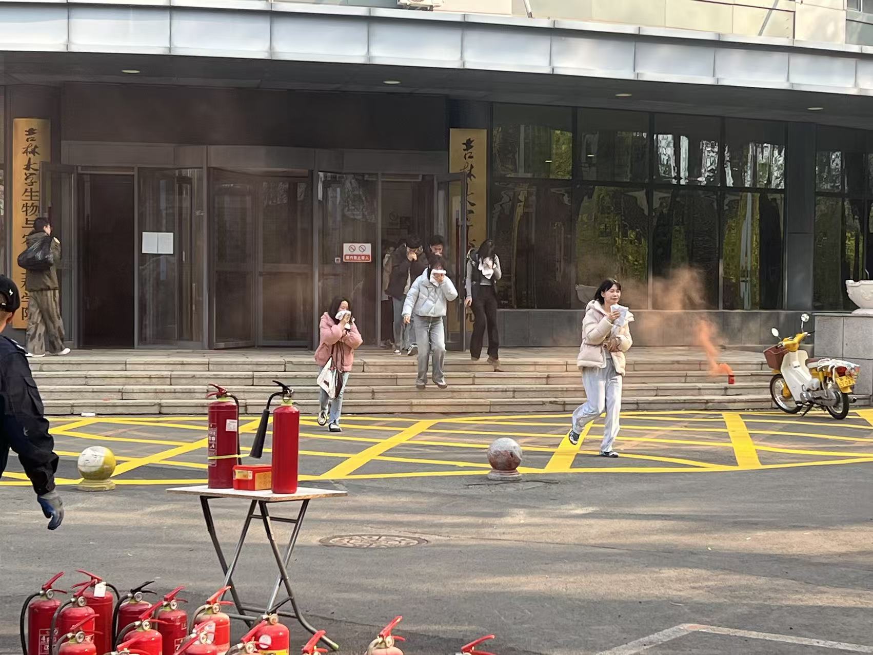 疏散集结完毕后,王中刚科长在现场继续讲解了灭火器的“提、拔、握、压”使用口诀及操作要领。在保卫科工作人员的全程监护下,师生们踊跃参与了灭火器使用的实操训练,亲身体验了初期火灾的扑救过程。